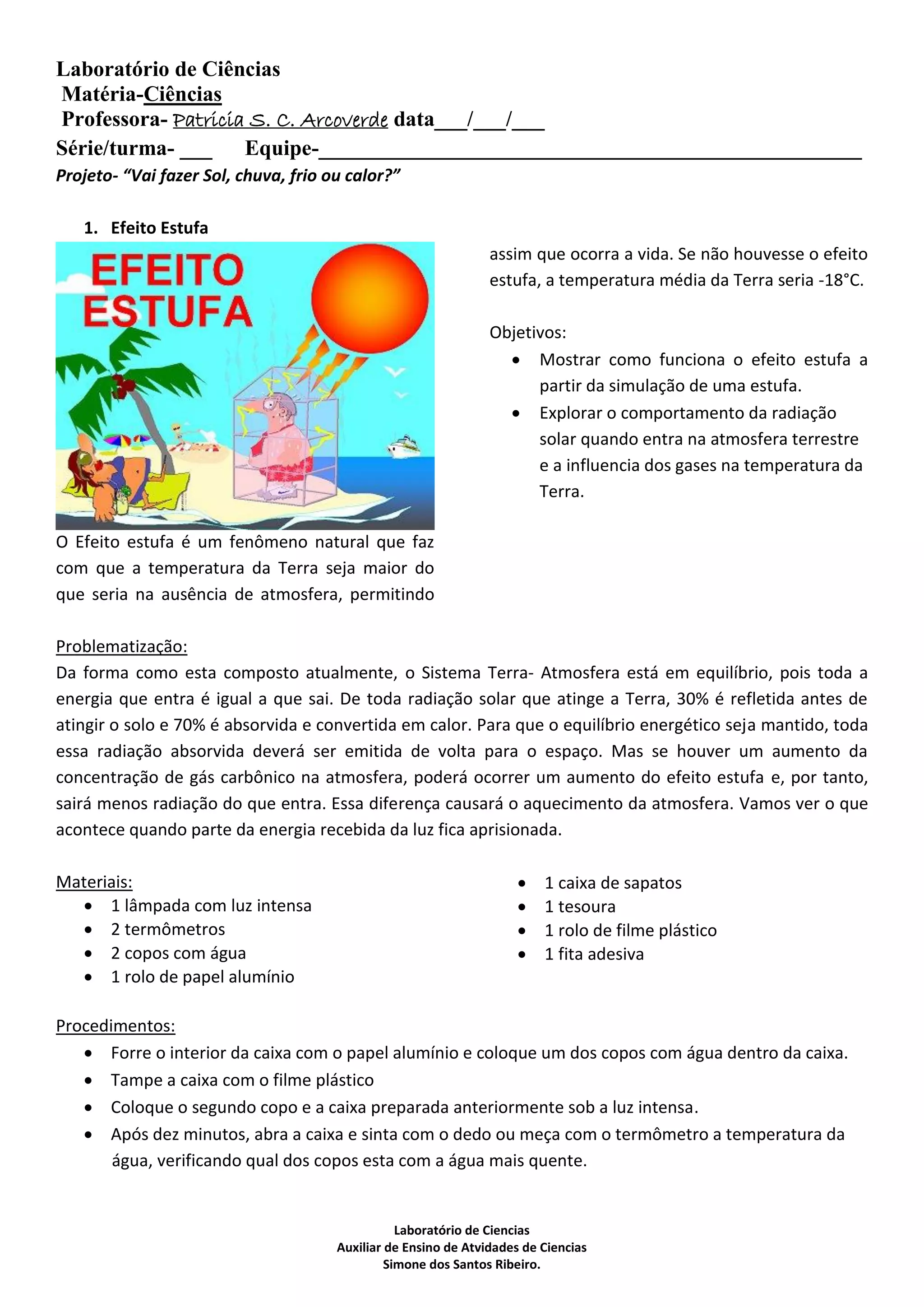 O documento descreve quatro experimentos científicos relacionados a efeito estufa, produção de CO2, respiração e combustão. O primeiro experimento simula o efeito estufa aquecendo água em copos cobertos e descobertos. O segundo mostra a produção de CO2 ao misturar vinagre e bicarbonato. O terceiro demonstra a troca de gases durante a respiração usando água calcária em um tubo. O quarto experimento observa a queima de uma vela para ilustrar a combustão e equação