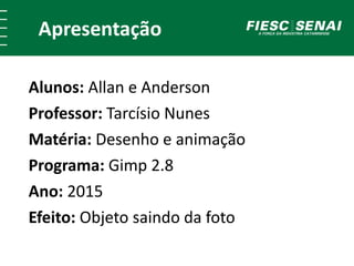 O documento fornece instruções passo a passo para criar um efeito no qual um objeto parece sair de uma foto usando o programa GIMP. Os passos incluem recortar o objeto em uma nova camada, aplicar uma textura de fundo, e adicionar sombras para dar a impressão de profundidade.