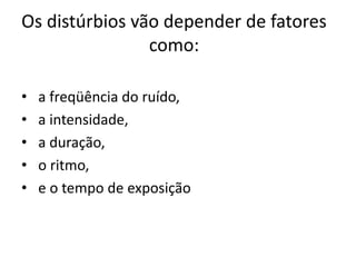 Os distúrbios causados pelo ruído dependem de fatores como frequência, intensidade, duração e tempo de exposição. O ruído pode causar problemas de comunicação, distúrbios do sono, mudanças de comportamento como falta de atenção e estresse, distúrbios neurológicos como tremores, e distúrbios cardiovasculares, hormonais e circulatórios como aceleração cardíaca e problemas de oxigenação das células.