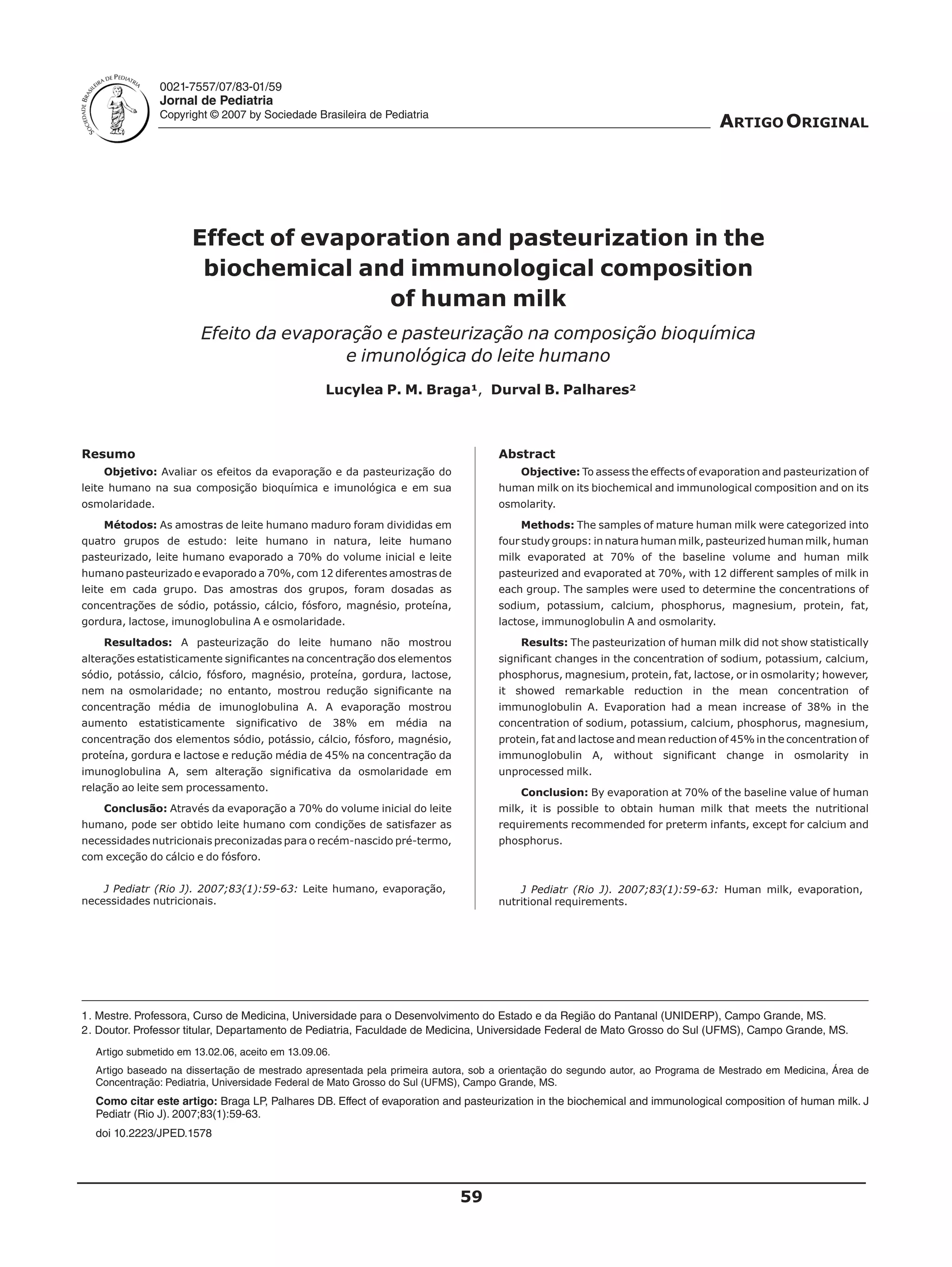 1. O estudo avaliou os efeitos da pasteurização e evaporação do leite humano em sua composição bioquímica, imunológica e osmolaridade. 2. A pasteurização não mostrou alterações significativas na maioria dos nutrientes, exceto na imunoglobulina A, que teve redução. 3. A evaporação aumentou em 38% a concentração da maioria de nutrientes, mas reduziu em 45% a imunoglobulina A, sem alterar a osmolaridade.