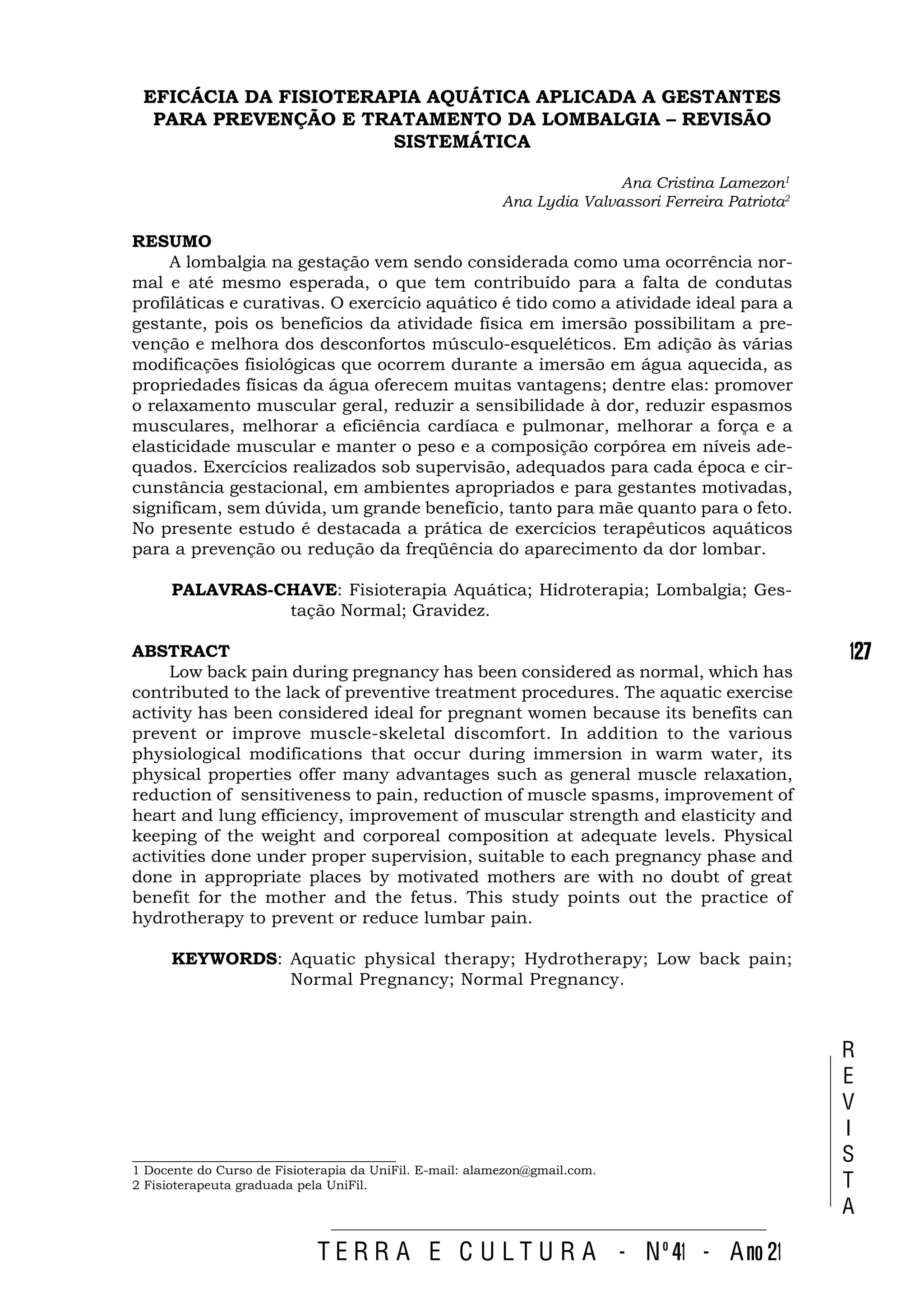 Este documento apresenta uma revisão sistemática sobre a eficácia da fisioterapia aquática aplicada a gestantes para prevenção e tratamento da lombalgia. A fisioterapia aquática oferece vantagens como relaxamento muscular, redução da dor e melhoria da força e elasticidade muscular, podendo prevenir alterações posturais e aliviar desconfortos durante a gravidez. Embora os exercícios aquáticos sejam benéficos, ainda não há consenso sobre os parâmetros ideais de intensidade e frequência.