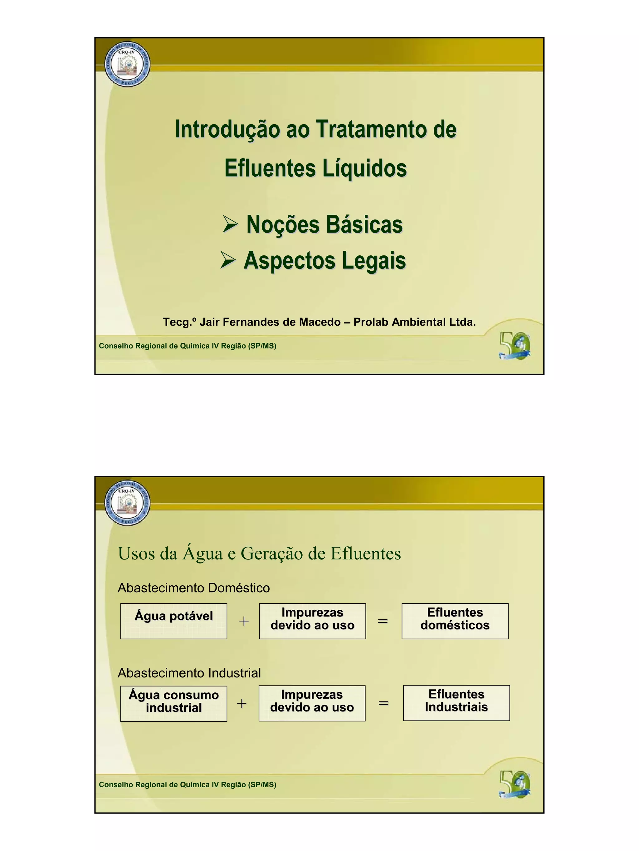 O documento introduz os conceitos básicos de tratamento de efluentes líquidos, abordando os principais tipos de efluentes gerados, seus constituintes, os níveis de tratamento, os sistemas mais comuns e a legislação aplicável definida pela Resolução CONAMA 357/05.