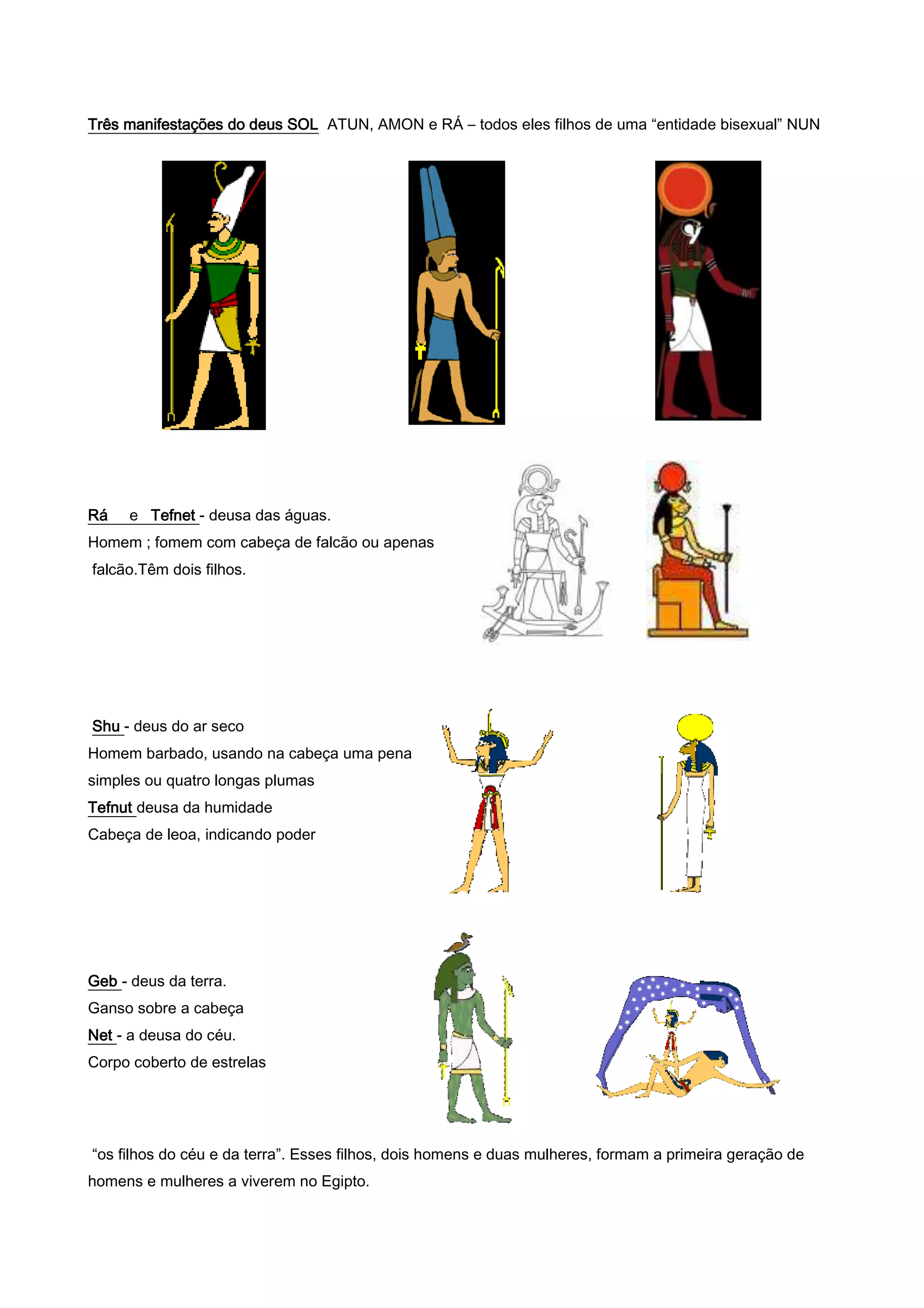 Os principais deuses do panteão egípcio incluem Osíris, deus dos mortos e da fertilidade; Ísis, deusa das artes e esposa de Osíris; e Seth, deus da maldade. Os egípcios acreditavam que após a morte as almas seriam julgadas por Osíris e precisariam conhecer as regras para se apresentar diante dele no tribunal dos mortos.