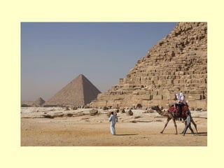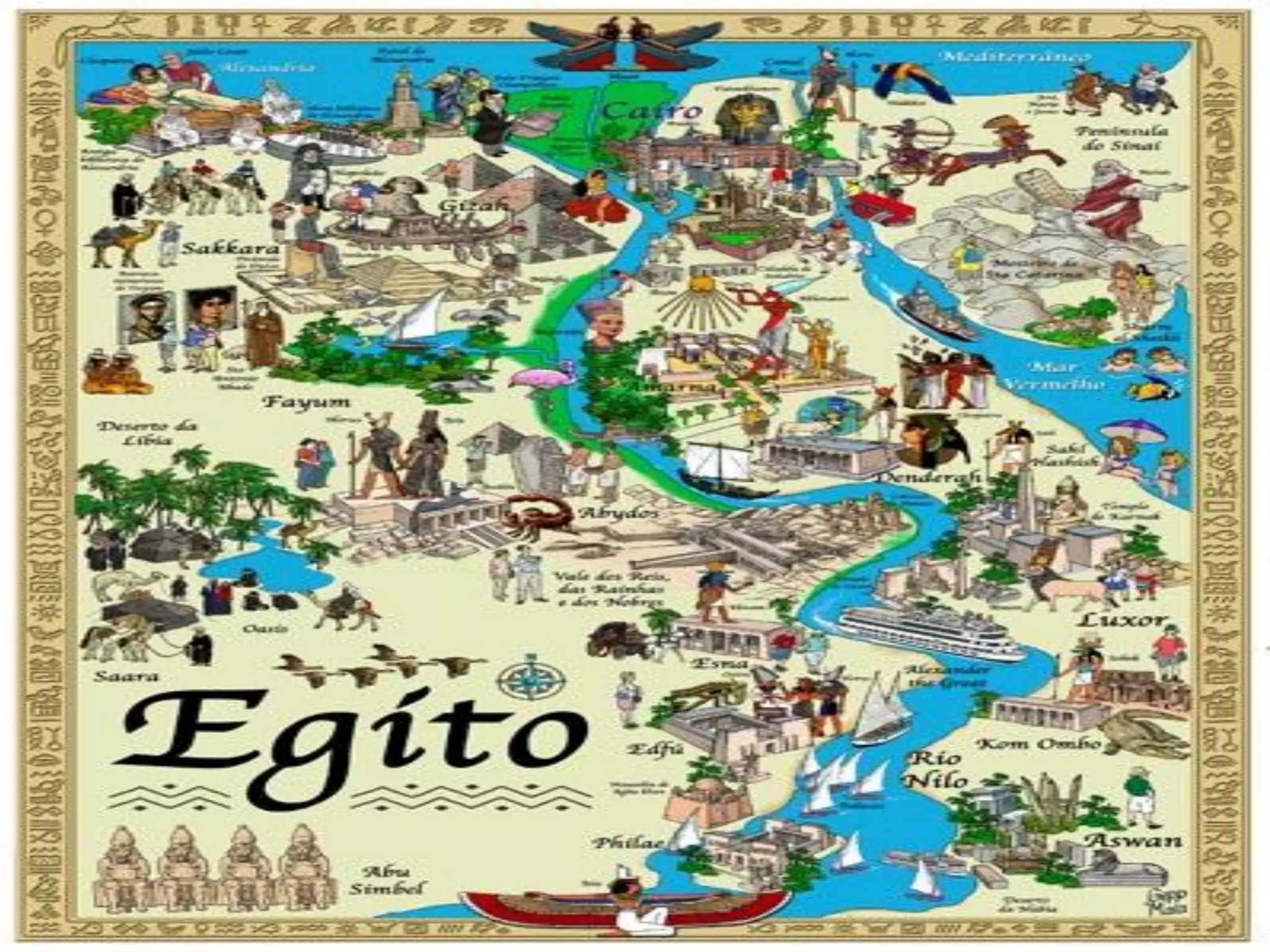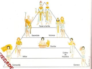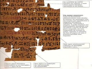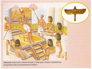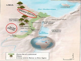 O documento descreve a localização geográfica do Egito Antigo e sua dependência do Rio Nilo para a agricultura. O Nilo transbordava anualmente entre junho e setembro, fertilizando a terra e tornando-a adequada para o plantio. Os egípcios desenvolveram um sofisticado calendário para prever as cheias do Nilo e as épocas de plantio e colheita.