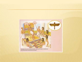 O documento descreve a geografia e a história do antigo Egito. O Egito era atravessado pelo rio Nilo, que permitia a agricultura. O país foi unificado por volta de 3200 a.C. sob o faraó Menés. A sociedade egípcia era hierarquizada e a economia baseava-se na agricultura e no comércio. Os egípcios desenvolveram uma escrita e religiões complexas com muitos deuses.