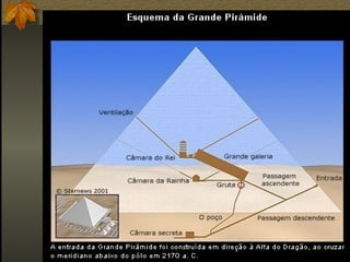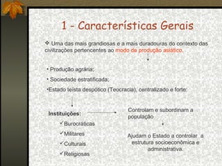 O documento descreve a civilização do Antigo Egito, abordando suas principais características, divisões históricas e aspectos econômicos, sociais e culturais. O Egito Antigo teve uma das civilizações mais duradouras, com uma sociedade estratificada e centralizada sob um Estado teocrático. Sua economia baseava-se na agricultura do Vale do Nilo e o Império passou por três fases principais: o Antigo Império, o Médio Império e o Novo Império.