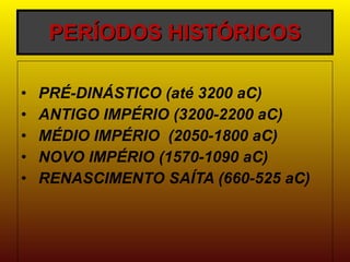 A civilização egípcia antiga passou por diversos períodos históricos, desde o Pré-Dinástico até o Renascimento Saíta. O Egito foi unificado por volta de 3200 a.C. sob o faraó Menés, dando início ao Antigo Império, marcado pela construção de pirâmides. Durante o Novo Império, os faraós expandiram o território egípcio através de conquistas militares. A religião egípcia era politeísta, venerando deuses como Amom-Ra,