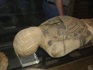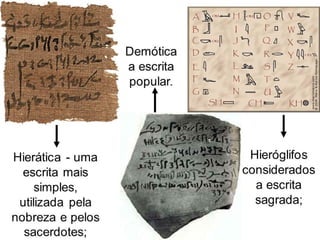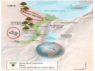 O documento descreve a civilização do antigo Egito, localizado na África entre os desertos da Líbia e da Arábia. O Egito era dividido em Alto Egito e Baixo Egito, unificados por volta de 3200 a.C. sob o faraó. A agricultura baseada no Rio Nilo permitiu o desenvolvimento da sociedade egípcia, hierarquizada em torno do faraó e deuses politeístas.