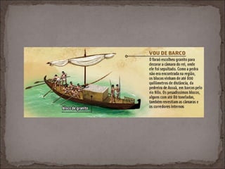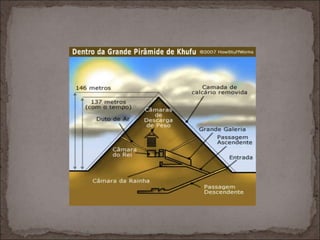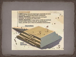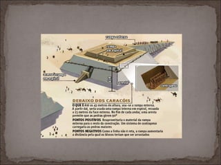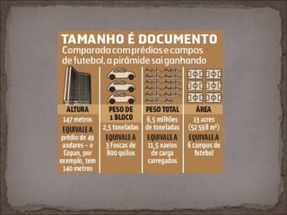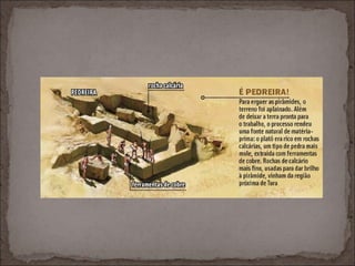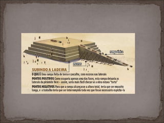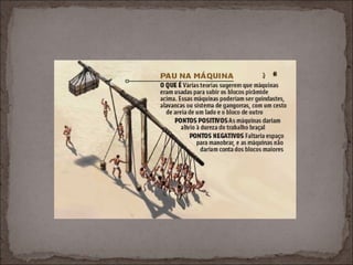 O documento descreve a construção das pirâmides do Egito Antigo, notadamente a Grande Pirâmide de Gizé. Estimava-se que 30 mil trabalhadores levaram 20 anos para erguer a pirâmide, transportando blocos de pedra de até 80 toneladas cortados em pedreiras ao longo do rio Nilo. A proeza de transporte e encaixe dos 2,3 milhões de blocos da pirâmide permanece um feito notável da engenharia antiga.