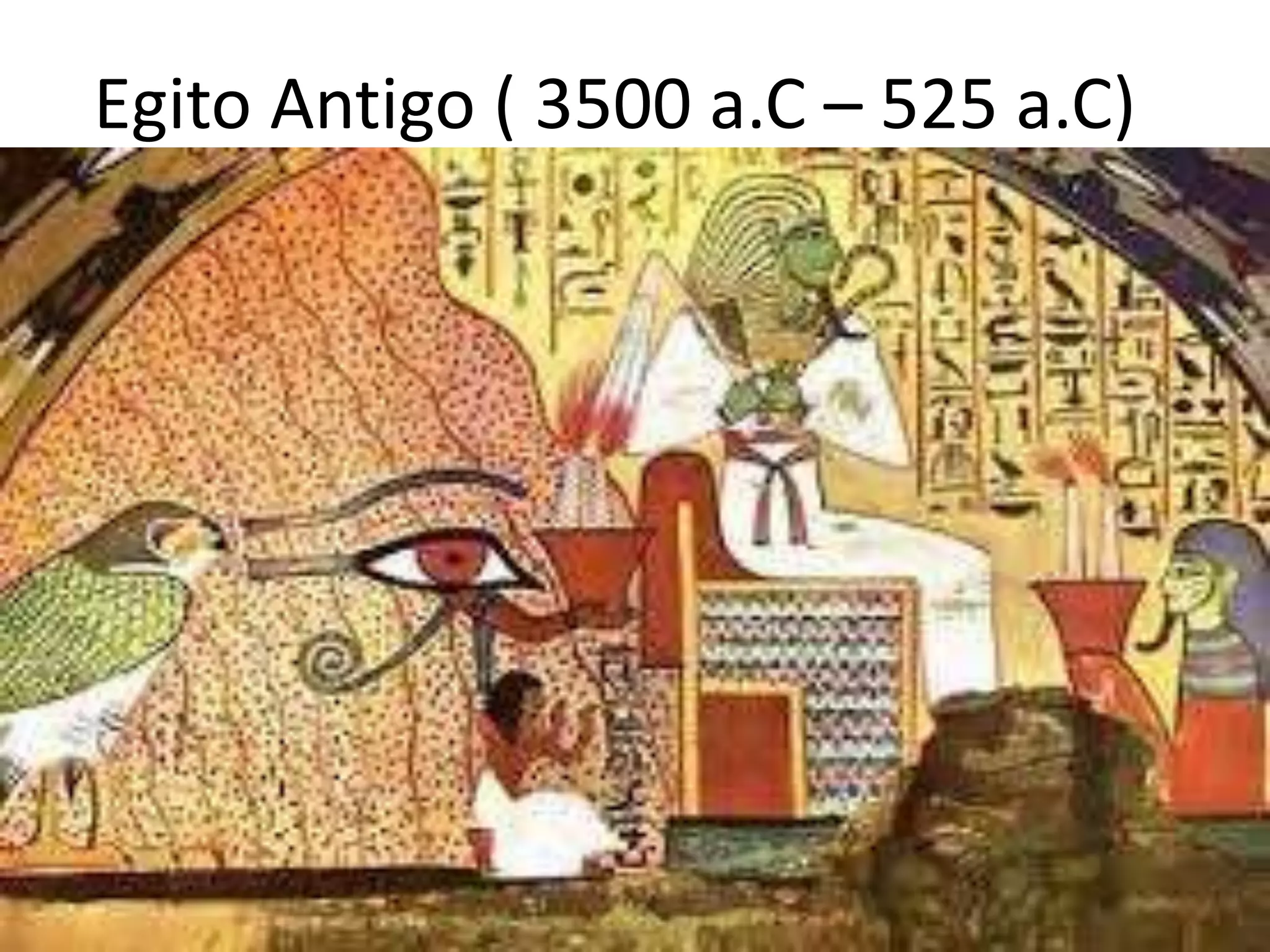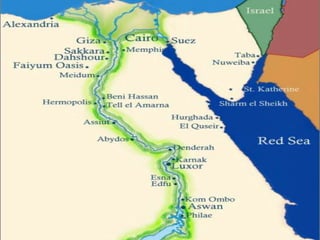 O documento descreve a civilização do Antigo Egito, dividida em períodos como Pré-Dinástico, Antigo Império, Médio Império e Novo Império. A sociedade egípcia era estratificada e centralizada em torno do faraó, que era considerado um deus vivo. A escrita hieroglífica e a religião politeísta também eram características importantes da cultura egípcia antiga.