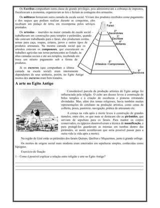 A sociedade egípcia antiga era altamente estratificada, com o faraó no topo e escravos na base. A agricultura ao longo do rio Nilo permitiu o desenvolvimento de vilas e cidades, com os egípcios construindo canais de irrigação e diques de proteção contra inundações. A arte egípcia era influenciada pela religião e mostrava deuses, além de cenas da vida cotidiana.
