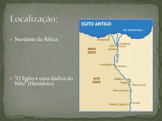 O documento descreve a sociedade e cultura do Antigo Egito. O Egito era governado por um faraó absoluto que controlava todos os aspectos da vida política, econômica e religiosa. A sociedade era altamente estratificada e hierárquica, com camponeses na base e o faraó no topo, apoiado por sacerdotes e nobres. A economia baseava-se na agricultura ao longo do rio Nilo, permitindo o desenvolvimento de uma cultura avançada com grandes obras arquitetônicas e avan
