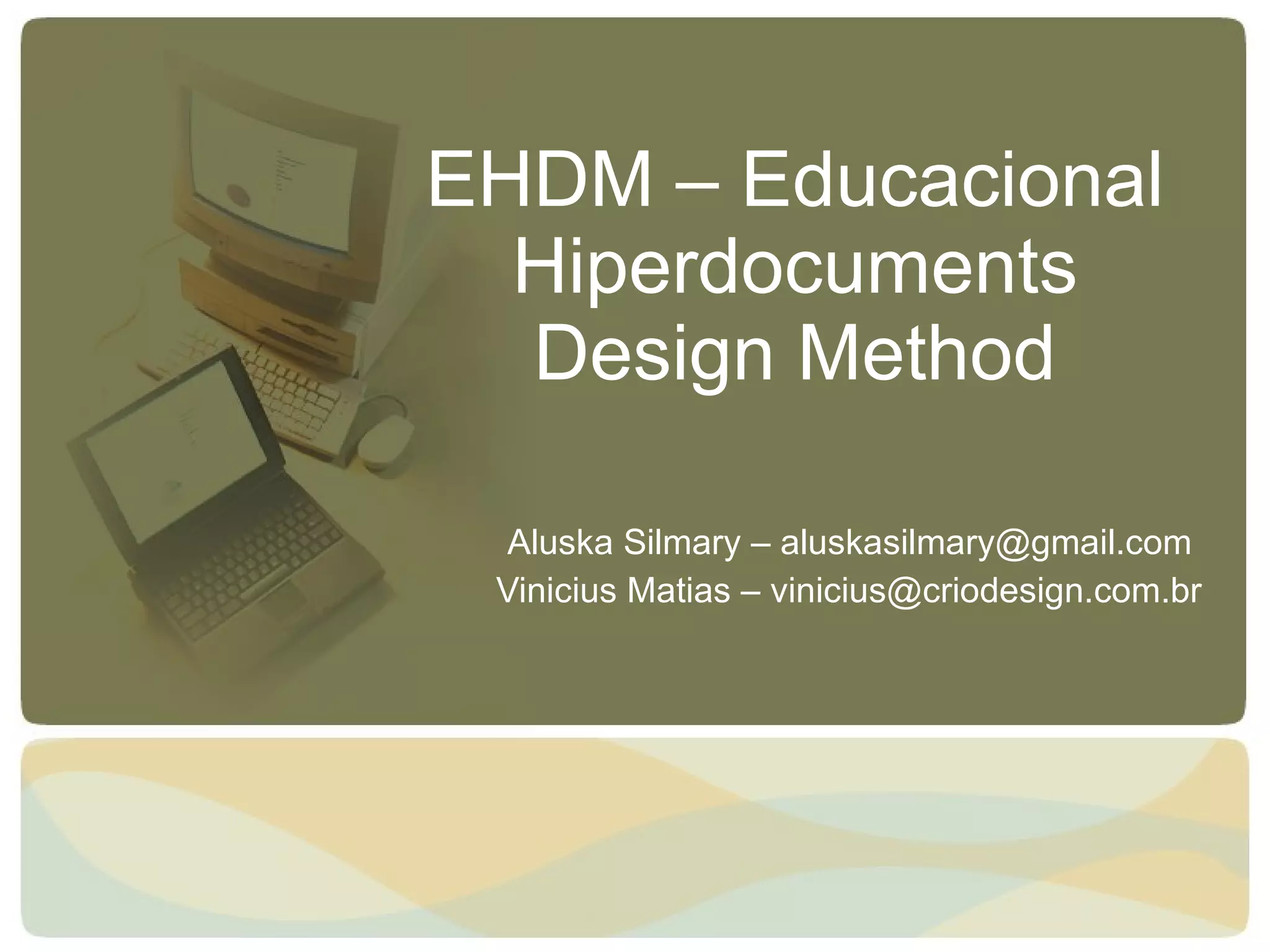 O documento descreve o EHDM (Educacional Hiperdocuments Design Method), um método para projetar hiperdocumentos educacionais. O método utiliza modelagem hierárquica e mapas conceituais para representar o domínio do conhecimento e categorizar informações em conceitos, resultados e exemplos. O modelo navegacional de contextos converte essa modelagem em objetos implementáveis através de diferentes abordagens.