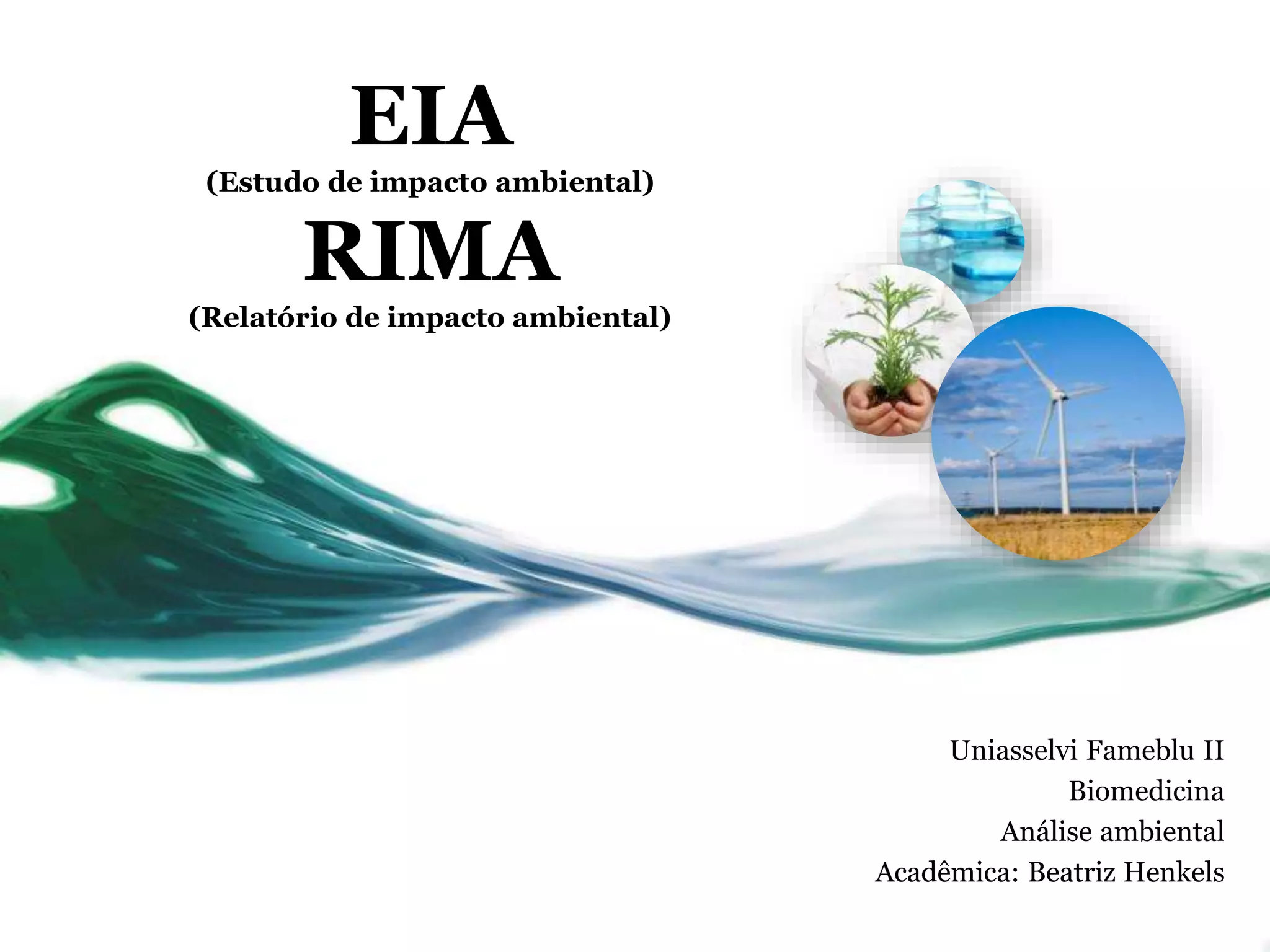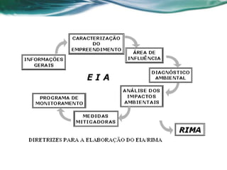 O documento descreve o que são EIA (Estudo de Impacto Ambiental) e RIMA (Relatório de Impacto Ambiental), definidos pela resolução CONAMA de 1986. Ele também lista as atividades que exigem esses estudos de acordo com a resolução e o IBAMA, incluindo projetos urbanísticos, industriais, agropecuários e de infraestrutura.