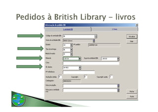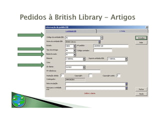 O Serviço de EIB permite solicitar documentos de outras bibliotecas. Os pedidos podem ser feitos por docentes e alunos de pós-graduação através do catálogo online ou por e-mail. Os pedidos são registrados no sistema Aleph e enviados às bibliotecas fornecedoras.
