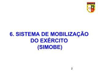 O documento descreve o Sistema de Mobilização do Exército (SIMOBE), incluindo sua finalidade de integrar processos e sistemas para gerenciar a mobilização militar terrestre, seus princípios como confiabilidade e interoperabilidade, e objetivos como manter registros de recursos militares e integrar com o SISMOMIL.
