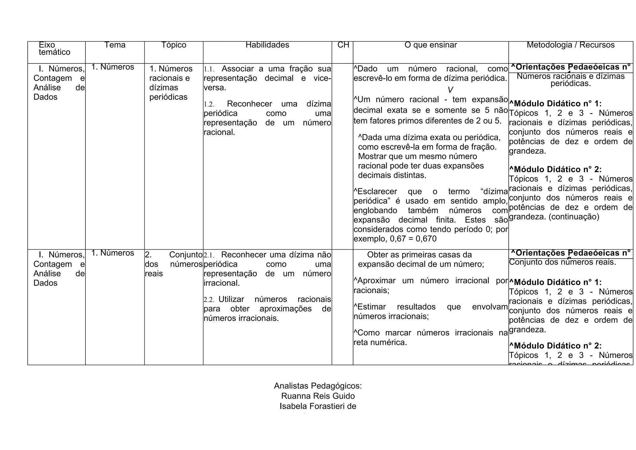 O documento apresenta um plano de ensino para o tema "Números, Contagem e Análise de Dados", dividido em subtemas como números racionais, conjuntos de números reais, probabilidade, estatística e funções. Para cada subtema são listadas as habilidades, conteúdos a serem ensinados, metodologias e recursos. O objetivo é orientar professores na abordagem desses tópicos matemáticos de forma a desenvolver competências essenciais nos estudantes.
