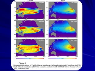 Este documento discute a variabilidade natural do clima da Terra, com foco no fenômeno de El Niño no Oceano Pacífico. El Niño enfraquece os ventos do leste no Pacífico central e oriental, aquecendo as águas e alterando os padrões de tempestade. Isso interrompe a pesca e agricultura em algumas regiões. El Niño também afeta outros oceanos e tem implicações para a distribuição de alimentos marinhos e doenças.