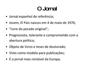O documento descreve a história do jornal espanhol El País desde sua fundação em 1976 como um jornal progressista e independente até se tornar o jornal mais rentável da Europa. Detalha seus fundadores, estilo, audiência, internacionalização e transição para o digital.