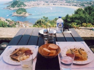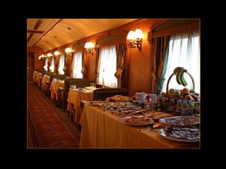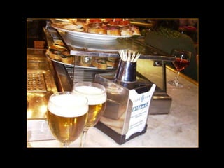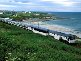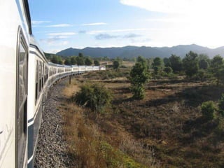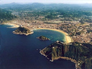 O documento descreve uma viagem de trem de Santiago de Compostela a San Sebastián na Espanha, cobrindo 700 km em 7 dias, com paradas noturnas em várias cidades ao longo do caminho para visitas, refeições e atividades. Detalha as etapas diárias da viagem, incluindo locais visitados, pratos típicos experimentados e atrações em cada cidade.