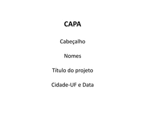 Este documento fornece instruções para a elaboração de projetos de pesquisa, incluindo seções como capa, folha de rosto, sumário, introdução, objetivos, justificativa, problematização, hipóteses, fundamentação teórica, metodologia, cronograma e referências.