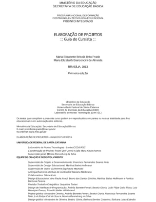 O documento apresenta o curso "Elaboração de Projetos" do Programa Nacional de Formação Continuada em Tecnologia Educacional (ProInfo Integrado). O curso tem como objetivo ensinar professores e gestores escolares a desenvolver projetos pedagógicos integrados com tecnologias. O currículo é estruturado em três unidades sobre projetos, currículo e tecnologias, e inclui encontros presenciais e atividades a distância. A primeira unidade aborda o conceito de projeto com um resgate histórico e