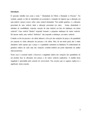 O documento discute os conceitos de elasticidade de demanda e oferta. A elasticidade refere-se à sensibilidade de uma variável em resposta a mudanças em outra variável, como a quantidade demandada em resposta a alterações no preço. Demandas elásticas respondem fortemente a mudanças de preço, enquanto demandas inelásticas respondem pouco. A elasticidade é calculada como a variação percentual na quantidade dividida pela variação percentual no preço.