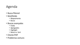 O documento apresenta uma introdução aos conceitos avançados do Elasticsearch, incluindo: (1) buscas filtered para combinar consultas e filtros, (2) multifields para indexação e busca em campos diferentes, e (3) agregações para resumir resultados de buscas agrupados por campos.