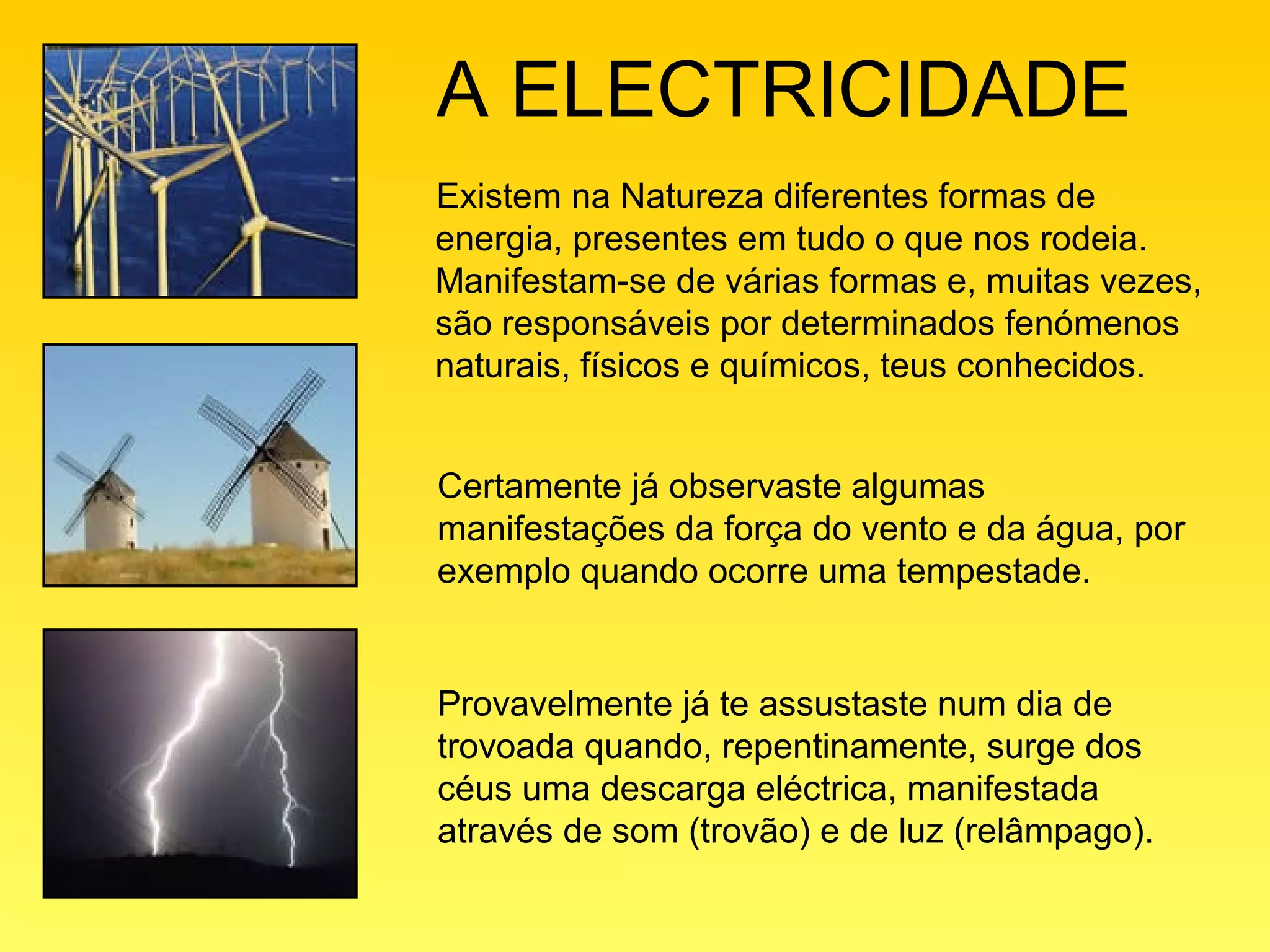 O documento discute as diferentes formas de energia presentes na natureza, com foco na eletricidade. Manifesta-se através de fenômenos como relâmpagos e trovões e é essencial para a vida, movendo praticamente tudo ao nosso redor através de usinas hidrelétricas. No entanto, alternativas renováveis como a energia solar e eólica podem ajudar a poupar recursos naturais.