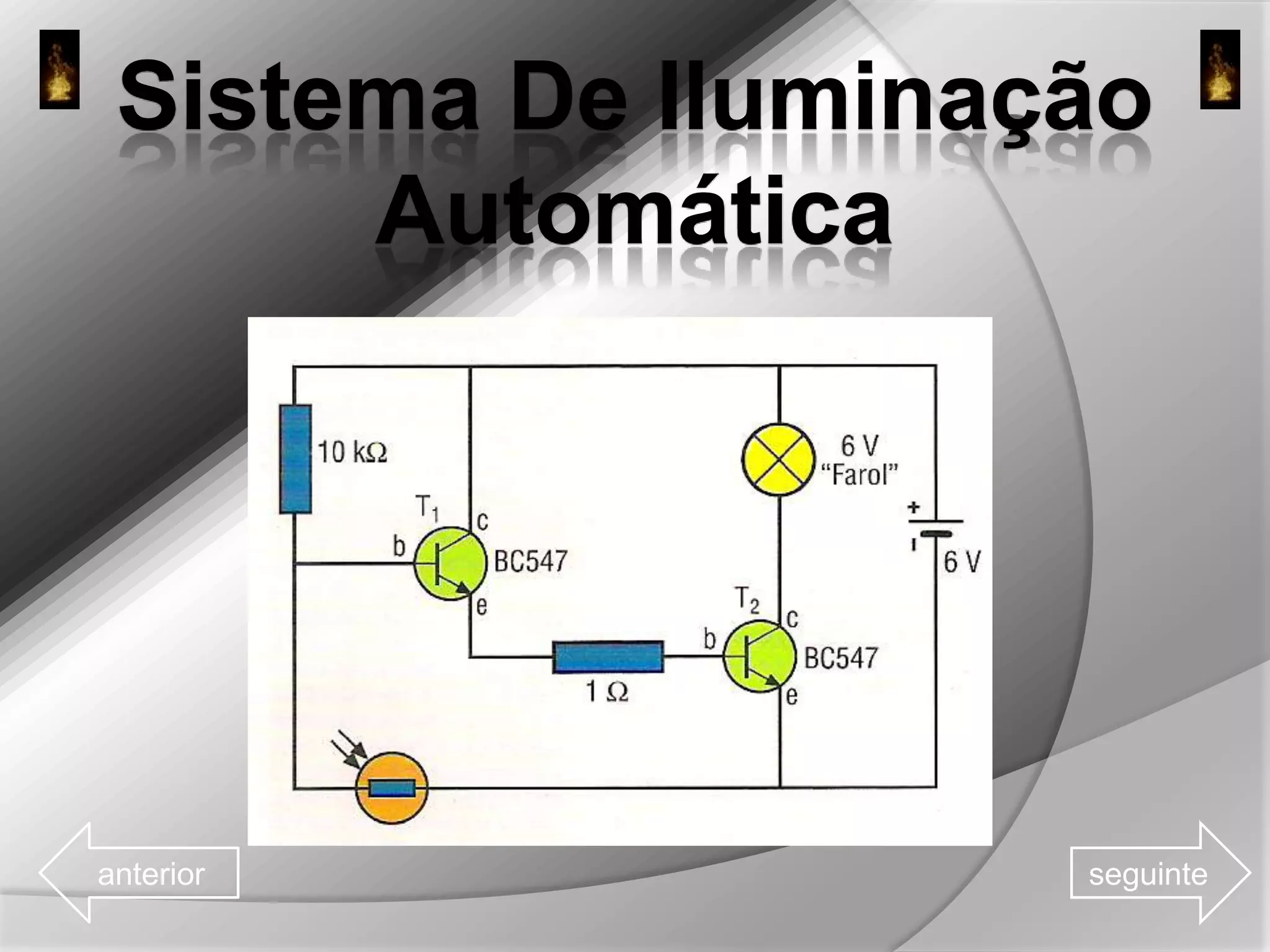 Este documento descreve os componentes e o funcionamento de um sistema de iluminação automática. Ele explica como um LDR (Resistor Dependente de Luz) detecta a luminosidade e controla uma lâmpada usando transistores, resistências e uma pilha. O documento também fornece detalhes técnicos sobre cada componente do circuito.