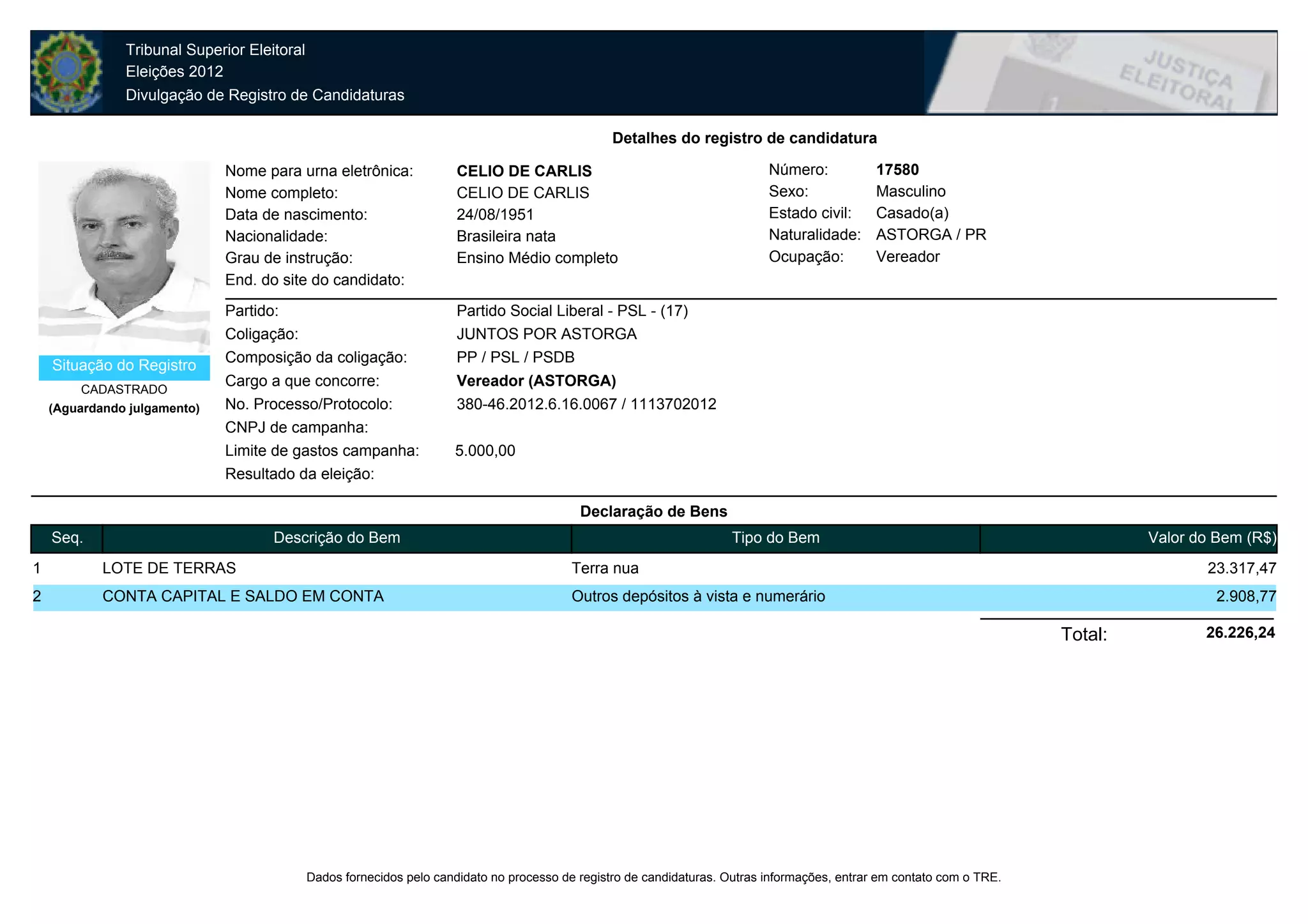 Celio de Carlis registrou sua candidatura a vereador em Astorga (PR) pelo PSL. Ele tem 61 anos, é casado, tem ensino médio completo e declara bens no valor total de R$26.226,24, incluindo terras e contas bancárias. Sua candidatura está cadastrada aguardando julgamento pelo Tribunal Regional Eleitoral.