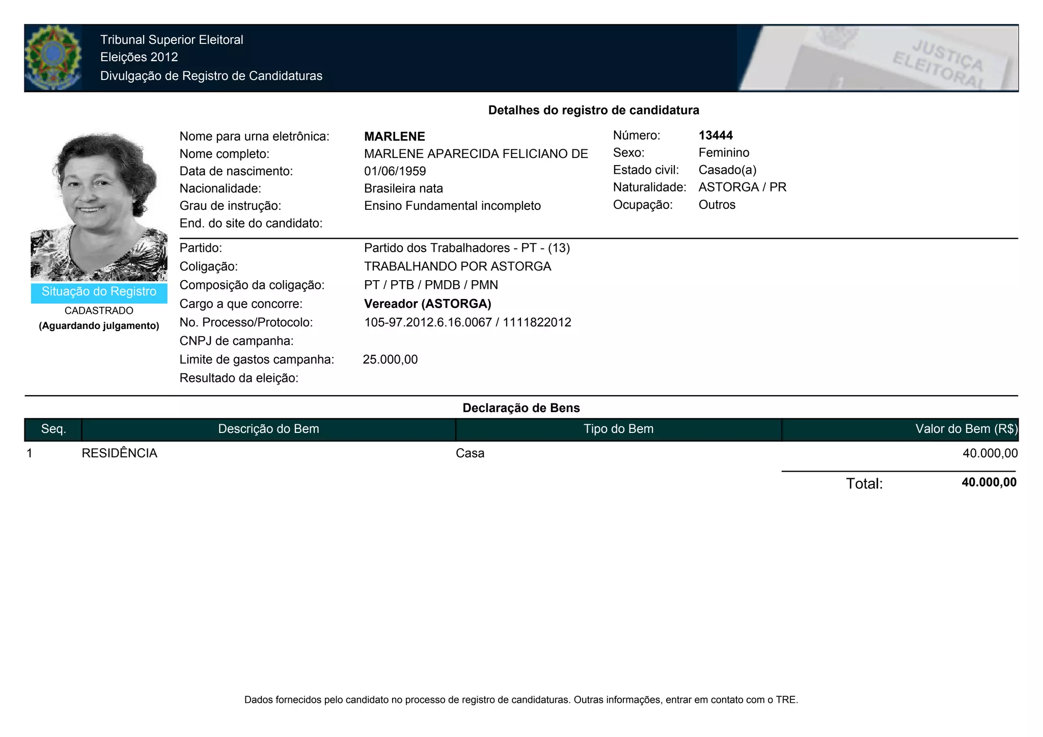 O documento resume o registro de candidatura de Marlene Aparecida Feliciano de para vereadora em Astorga (PR) pelo PT. Ela tem 59 anos, é casada, tem ensino fundamental incompleto e declarou ter um patrimônio de R$40.000,00 consistindo apenas de uma residência. Sua candidatura está cadastrada aguardando julgamento.