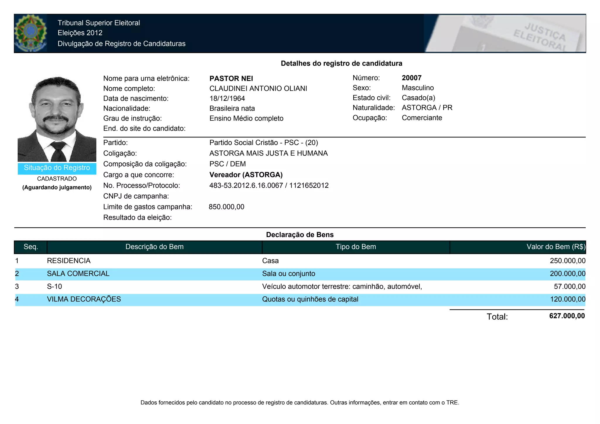 O documento resume o registro de candidatura de Claudinei Antonio Oliani como vereador pelo Partido Social Cristão em Astorga (PR). Ele é casado, tem ensino médio completo e declara um patrimônio de R$627.000,00 que inclui uma casa, uma sala comercial, um veículo e quotas em uma empresa. Seu registro está cadastrado aguardando julgamento.