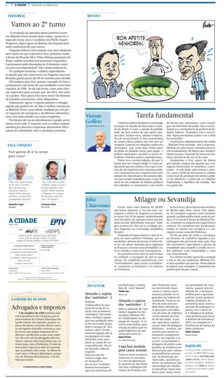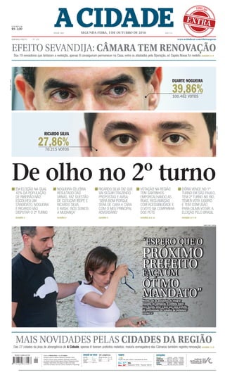 O documento resume os resultados da votação do primeiro turno das eleições municipais em Ribeirão Preto, São Paulo. Duarte Nogueira, do PSDB, liderou a votação com 39,86% dos votos e disputará o segundo turno contra Ricardo Silva, que obteve 27,86% dos votos. A votação no restante da região também é destacada, com ênfase na renovação das câmaras municipais.