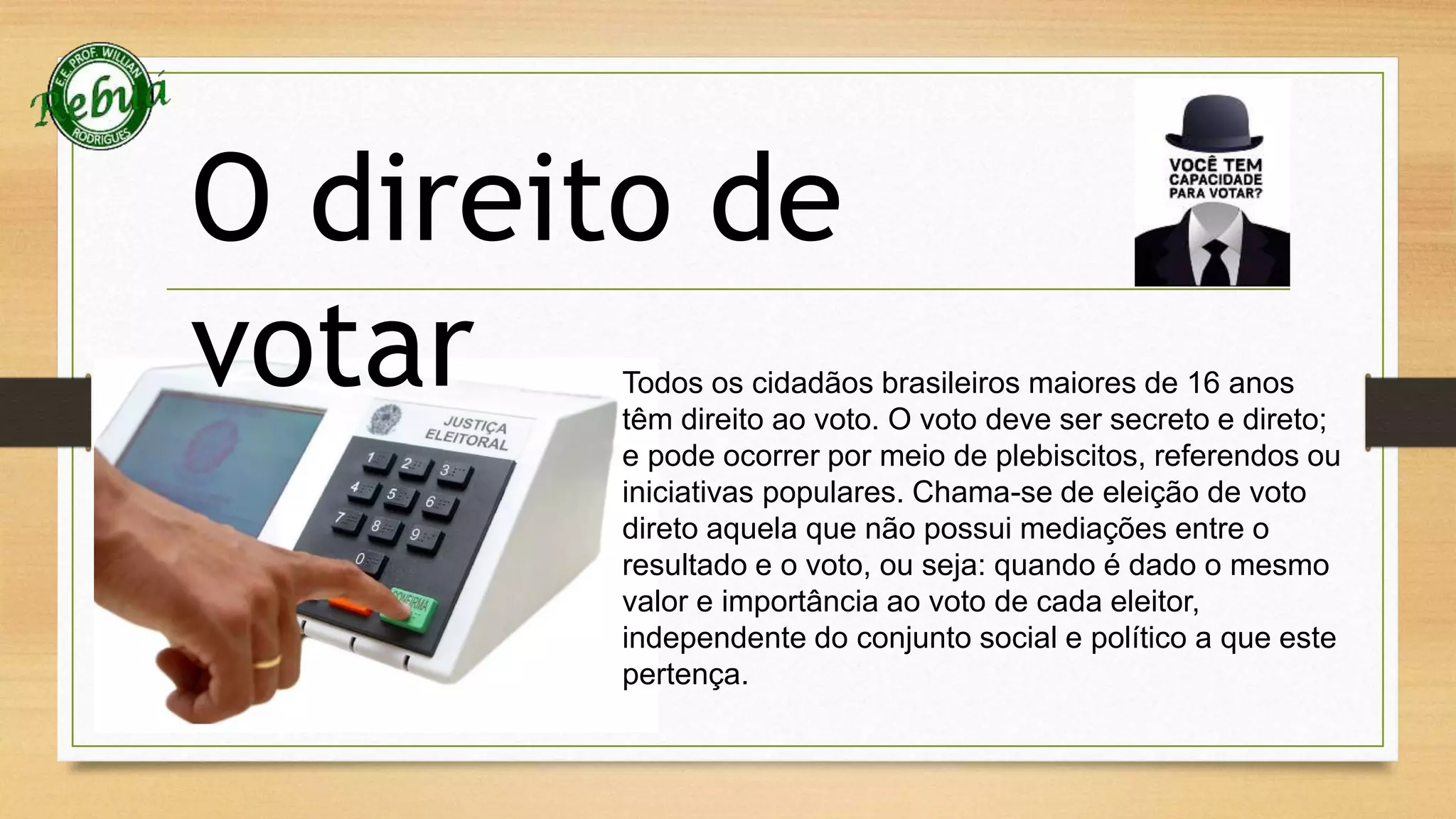 O documento discute o direito ao voto no Brasil, incluindo: (1) Todos os cidadãos brasileiros maiores de 16 anos têm direito ao voto; (2) Em 1934, o Código Eleitoral consolidou o direito das mulheres ao voto, removendo restrições anteriores; (3) Embora adolescentes a partir de 16 anos tenham o direito constitucional ao voto, sua participação vem diminuindo na prática.