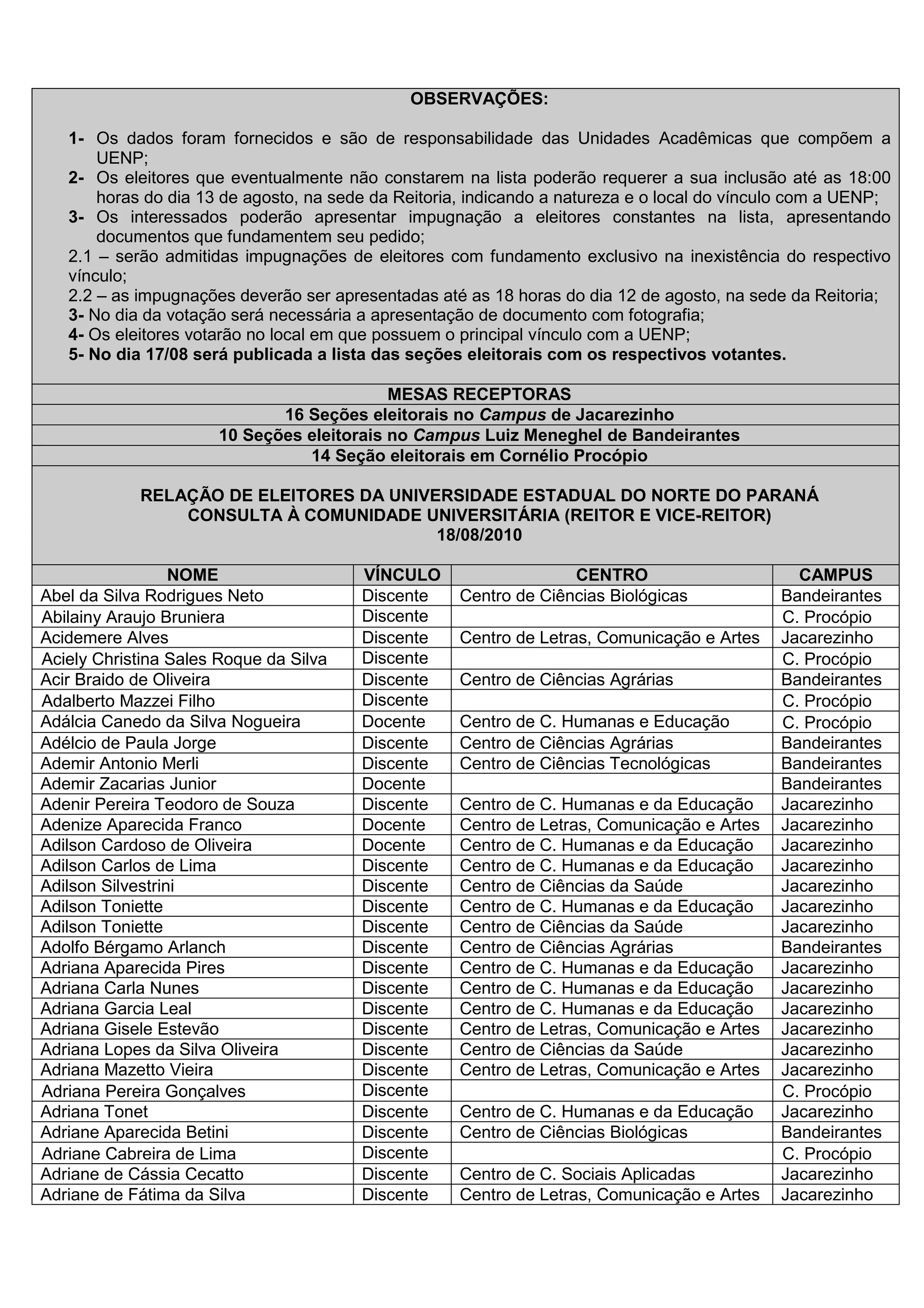 Este documento fornece informações sobre o processo eleitoral para Reitor e Vice-Reitor da Universidade Estadual do Norte do Paraná (UENP) em 18 de agosto de 2010, incluindo a lista de eleitores por campus e centro, observações sobre inclusão/impugnação de eleitores, local de votação, e datas importantes.