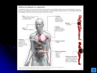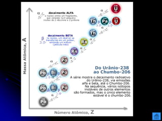O documento resume as principais partículas subatômicas, como prótons, nêutrons e elétrons. Também discute a representação dos elementos químicos e conceitos como isótopos, íons, radioisótopos e suas propriedades. Explica os tipos de radiação ionizante como alfa, beta e gama e seus efeitos na matéria, além de conceitos como meia-vida radioativa.