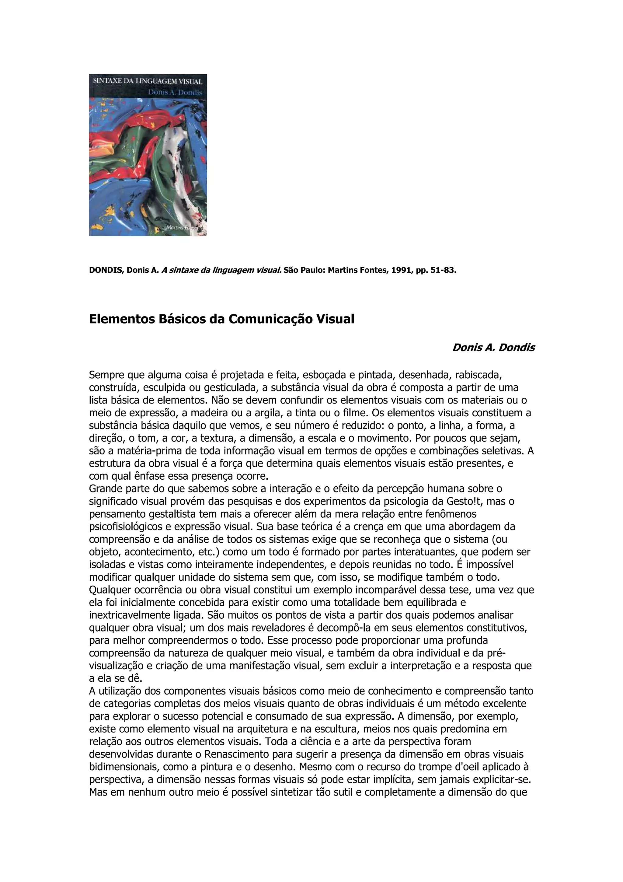 Este documento discute os elementos básicos da comunicação visual, como ponto, linha, forma, direção, tom e cor. Ele explica que esses poucos elementos constituem a matéria-prima de toda informação visual e como eles podem ser combinados e manipulados. O documento também discute as qualidades e significados associados a cada um desses elementos individuais.