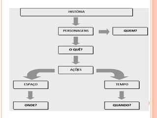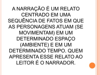 O documento discute os principais elementos da narrativa, incluindo o narrador, personagens, enredo, tempo e ambiente. Explica que a narrativa é um relato de uma sequência de eventos envolvendo personagens em um determinado espaço e tempo. Detalha os diferentes tipos de narradores e focos narrativos, assim como personagens principais, secundárias e planas versus redondas. Por fim, aborda as formas de estruturar o enredo e os conceitos de tempo cronológico versus psicológico e ambiente físico versus psicol