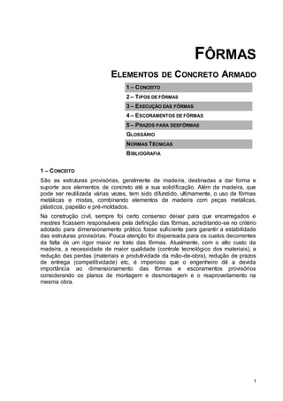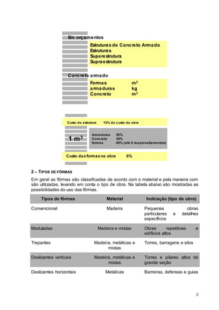 O documento discute os conceitos e tipos de formas para concreto armado, incluindo formas de madeira, chapas compensadas, formas metálicas e mistas. Detalha os procedimentos para a execução de formas para pilares e vigas, como a transferência de eixos, marcação, travejamento e conferência antes da concretagem.
