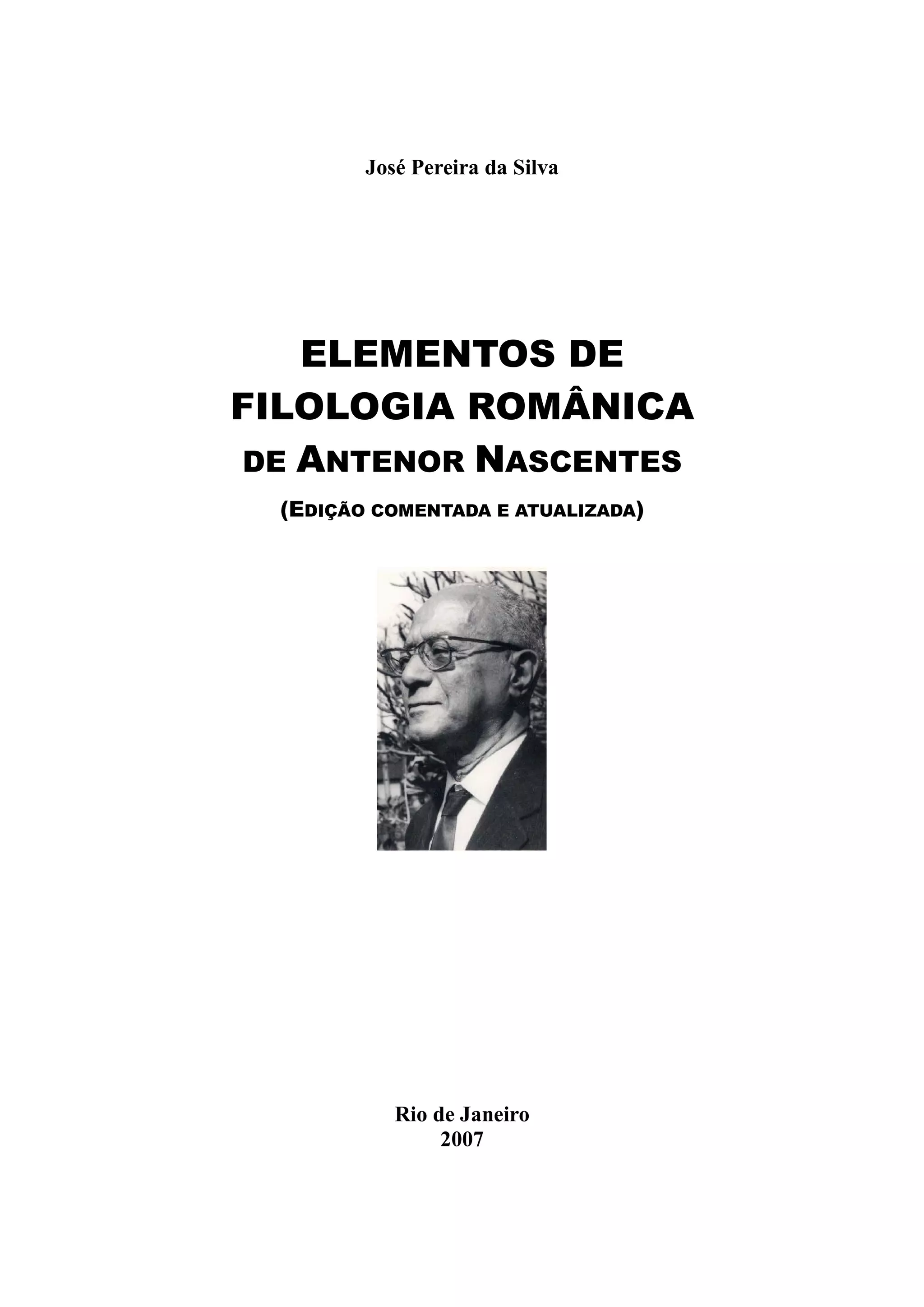 Este documento é um livro sobre elementos da filologia românica escrito por Antenor Nascentes. O livro discute o histórico da filologia românica, o latim vulgar e as características fonéticas e morfológicas das línguas românicas. Ele também inclui exemplos de textos em várias línguas românicas como galego, espanhol, provençal, italiano, francês e romeno.