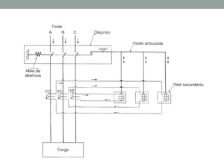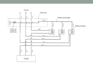 O documento aborda equipamentos de subestações elétricas, como transformadores e dispositivos de proteção. Destaca os tipos de transformadores usados na geração, transmissão e distribuição de energia, além de discutir para-raios, disjuntores e relés, suas funções e características construtivas. Apresenta detalhes sobre fusíveis e suas importâncias para a proteção de circuitos elétricos contra sobrecargas e curtos-circuitos.