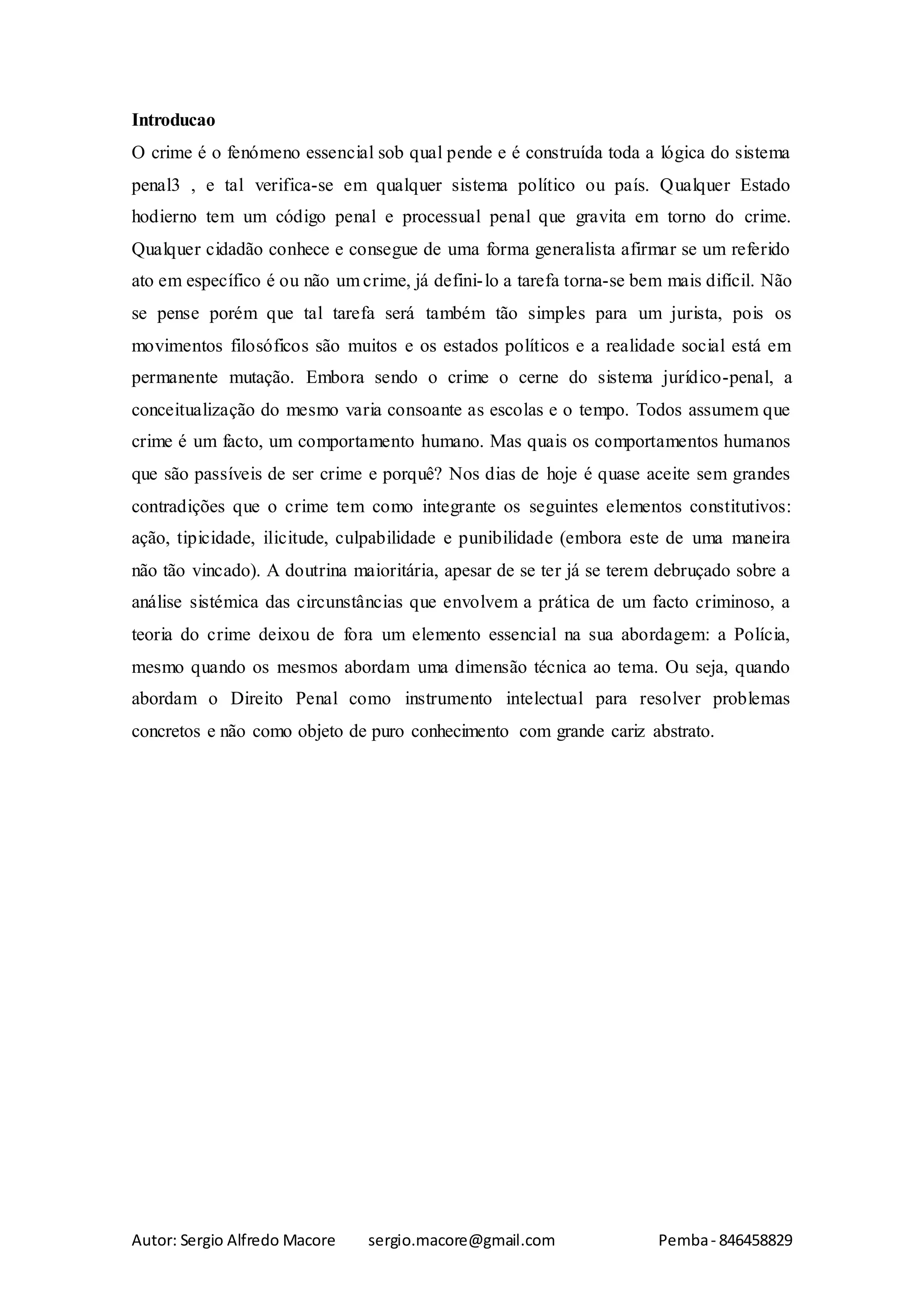 O documento discute os elementos constitutivos do crime. Define crime como um ato proibido pela lei penal que possui uma pena associada. Explica que um crime requer tipicidade, ilicitude e culpabilidade. Detalha cada um destes elementos, incluindo suas definições e subcategorias.