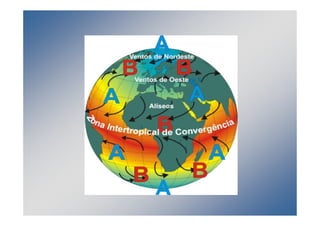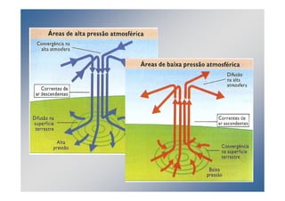 O documento discute os elementos e fatores que influenciam o clima, incluindo temperatura, pressão atmosférica, ventos, umidade do ar, massas de ar, latitude, altitude, maritimidade vs continentalidade, correntes marítimas e vegetação. É explicado como esses fatores afetam os tipos de tempo e precipitação em diferentes lugares.