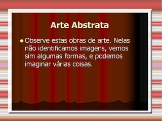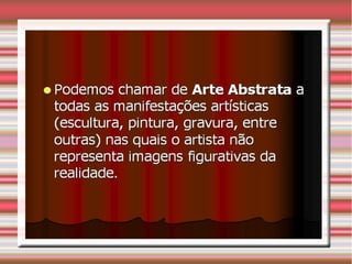 O documento discute as diferenças entre arte figurativa e não-figurativa. A arte figurativa representa o mundo real através da perspectiva, enquanto a arte não-figurativa ou abstrata comunica através de cores e materiais sem representar objetos reconhecíveis. Existem também estilos intermediários como o impressionismo. A arte abstrata permite múltiplas interpretações e convida o observador a participar mais ativamente.