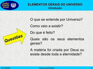 O documento discute os elementos gerais do universo de acordo com a doutrina espírita. Apresenta que o universo é composto por Deus, espírito e matéria. Explica que a matéria foi criada por Deus há bilhões de anos e evoluiu ao longo do tempo, formando a Terra, o sistema solar e as galáxias. Também descreve que o espírito se une à matéria por meio do perispírito para sua evolução.