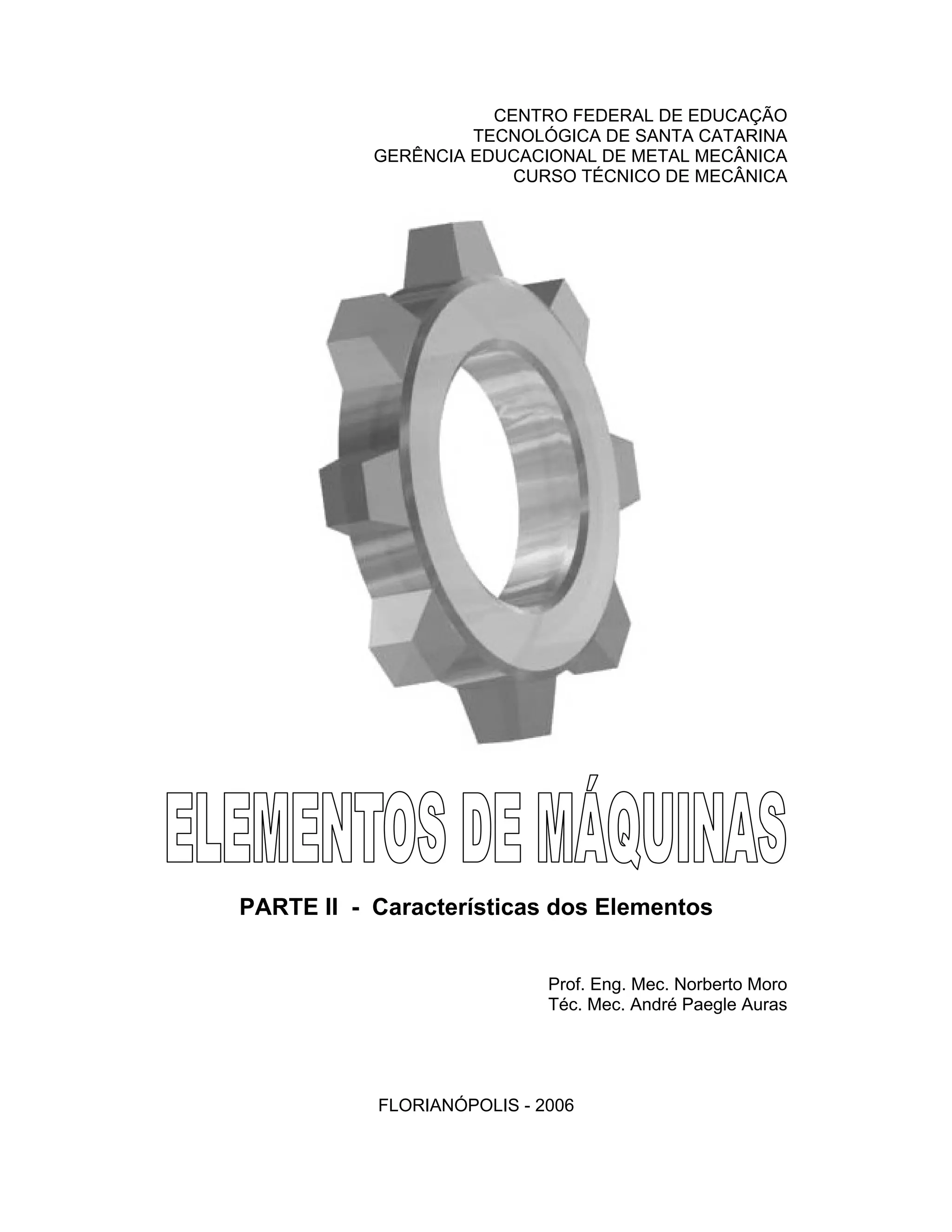 Este documento descreve os principais elementos de fixação e transmissão utilizados em máquinas, incluindo rebites, pinos, parafusos, engrenagens e outros. É dividido em seções tratando de elementos de fixação, elásticos, apoio e transmissão, definindo cada tipo de elemento e suas aplicações.
