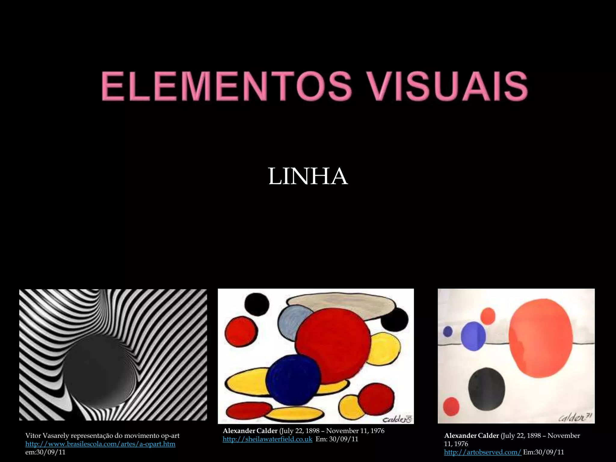 O documento discute a função da linha nas artes visuais, mencionando sua capacidade de direcionar o olhar, quebrar padrões e criar composições gráficas dinâmicas, conforme utilizada por artistas como Calder e Vasarely.