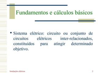 O documento descreve os fundamentos das instalações elétricas de acordo com a norma ABNT NBR 5410:2004, definindo sistemas elétricos, instalações elétricas, componentes, linhas elétricas e serviços de segurança. A norma estabelece requisitos de segurança para instalações elétricas de baixa tensão.