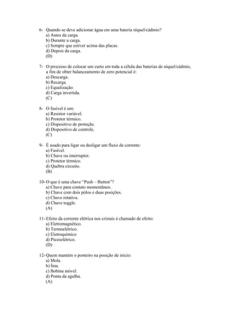(1) O documento é um gabarito de um teste sobre eletricidade básica para mecânicos de manutenção aeronáutica. (2) Aborda conceitos como baterias, geradores, instrumentos de medição e circuitos elétricos. (3) Fornece as respostas corretas para 30 questões objetivas sobre esses tópicos.